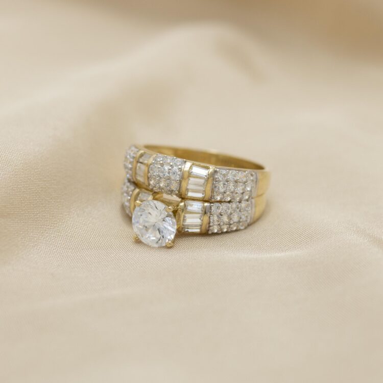 Anillo de matrimonio con zirconia, baguette y detalles en micro pavé